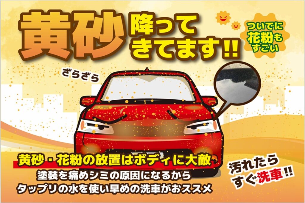 黄砂がおクルマに付着したまま放置すると、塗装の劣化細かい傷を引き起こし愛車の美観を損ねてしまう原因にもなります。また、ガラスに付着すると視界の妨げとなり安全面にも支障が出てしまうこともあります。
